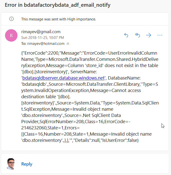 As a result, after running a pipeline, along with the expected results I now can receive an email notification if something fails (to test the failed event notification, I temporarily changed the name of a table that I use as a destination in my Copy Data task).