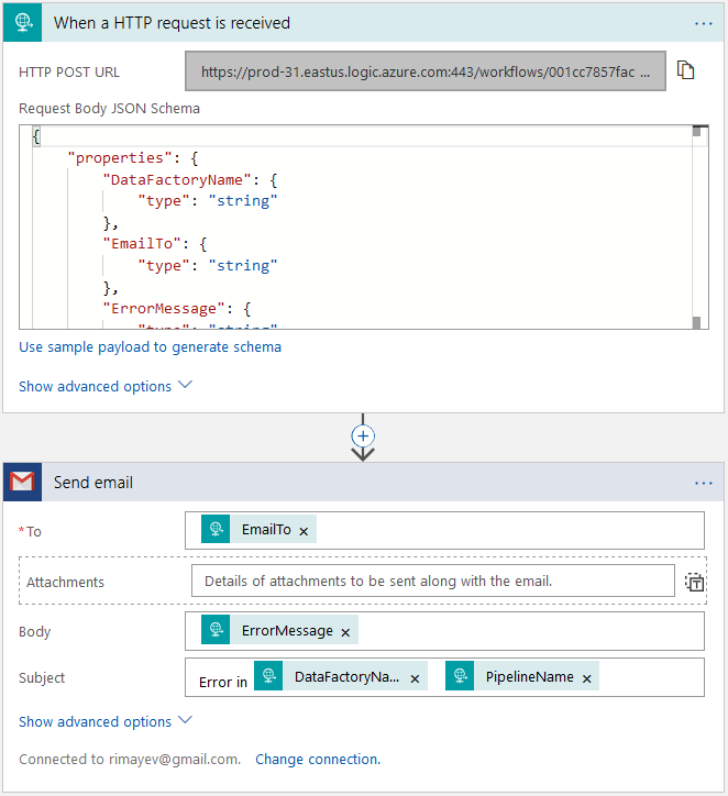 Writing this blog, I give a full credit to this resource - http://microsoft-bitools.blogspot.com/2018/03/add-email-notification-in-azure-data.html by Joost van Rossum from Netherland, that has step-by-step instructions to create ADF Notification Logic Apps in Azure. I have just made a slight modification to this solution to support the functionality of the existing ADF pipeline from my previous blog post - http://datanrg.blogspot.com/2018/11/system-variables-in-azure-data-factory.html
