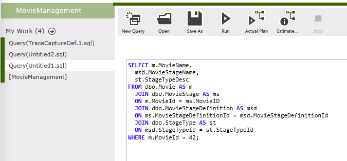 Pretty prominent in the upper left corner, you can see the New Query button. I’m sure you’ll be shocked to find that clicking on that gives you another window in the portal as shown below. Worth noting though is the listing under My Work on the left side of the screen. These are more or less windows that you can switch between, without losing your work. It’s almost like tabs in SSMS. You can open multiple queries as you see. I have two unnamed queries I’m playing with and a file, TraceCaptureDef.1.sql, which will generate all sorts of fun errors if I try to run it on Azure. But the main point is, don’t feel like you have to open multiple tabs in your browser, you have a lot of control right there in the Management Portal.