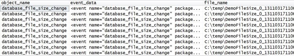 SELECT * FROM sys.fn_xe_file_target_read_file('C:\temp\DemoFileSize*.xel',NULL, NULL, NULL);