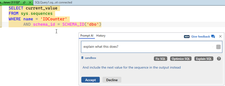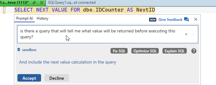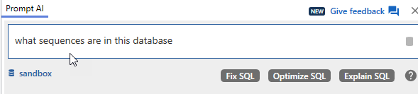 I know I’ve done some testing lately with sequences for a customer, so I decided to ask Prompt AI to help. I connected to a database and asked this question after clicking ALT+Z.