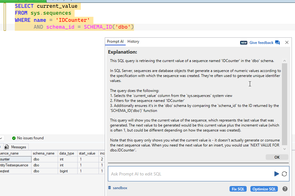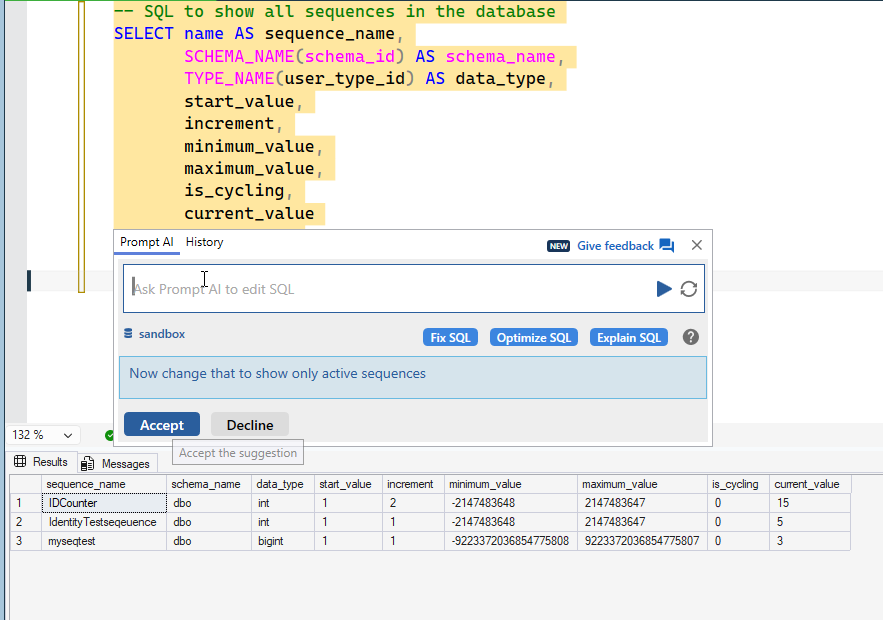 I got this response, which I executed before accepting the code. One thing I like about SQL Prompt is I can execute code and then adjust my prompt (or paste in an error). As you can see, I have 3 sequences in this database. I get a bunch of the meta data, including the current_value.