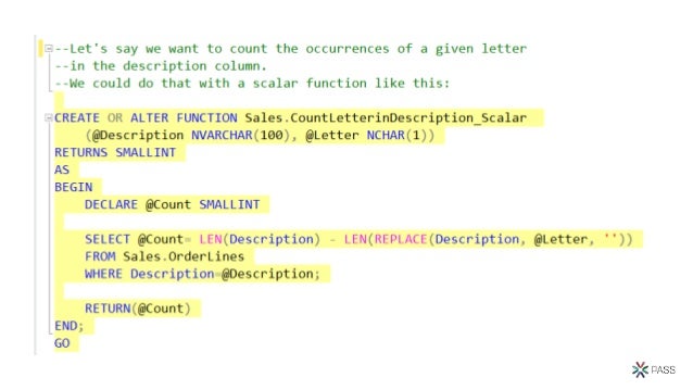 9. CREATE FUNCTION [schema].[function_name] (@parameter_name AS INT) RETURNS INT –WITH SCHEMABINDING, … AS BEGIN RETURN END GO Scalar function syntax