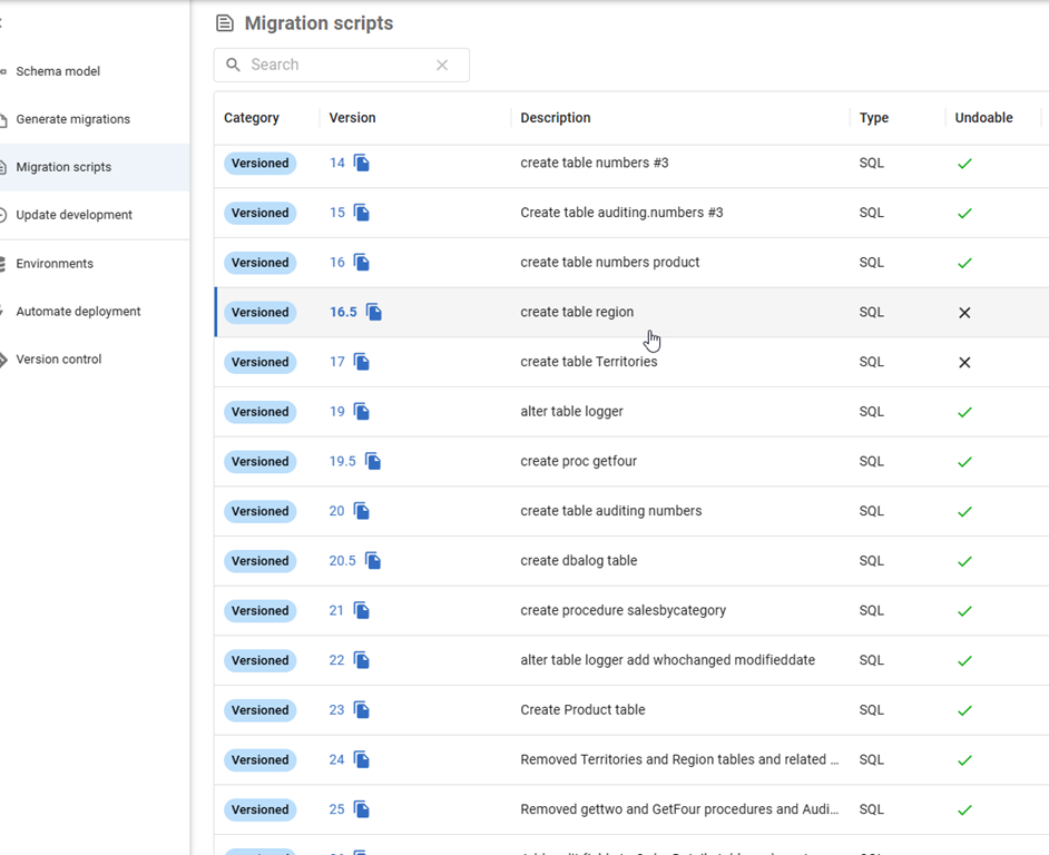 When a developer creates a migration script, they often do this close to the time they are making the changes in development. Not always, but I find a lot of customers change something, test it, and then make the migration script. Guidance for a lot of customers is to keep the migration scripts simple and easy. For example, here’s one I have that creates a simple table. If you look in the image on v23, which says “Create Product Table” in the description, that is what it does.