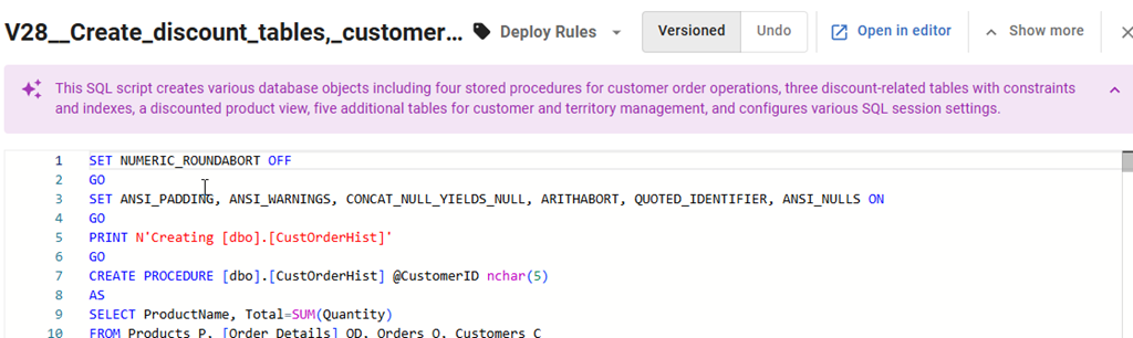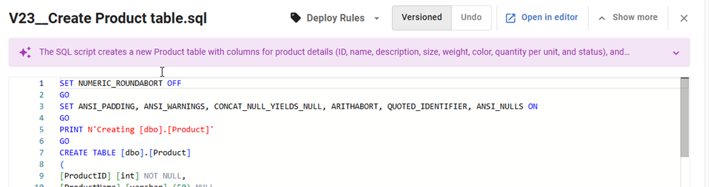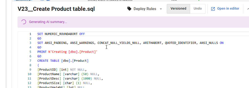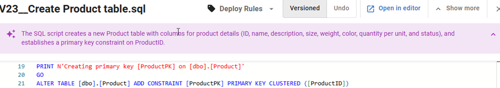 If I click on this line, I see the script shown below the name (V23__Create Product Table.sql). The new thing just below in this image is that an AI summary is being generated.