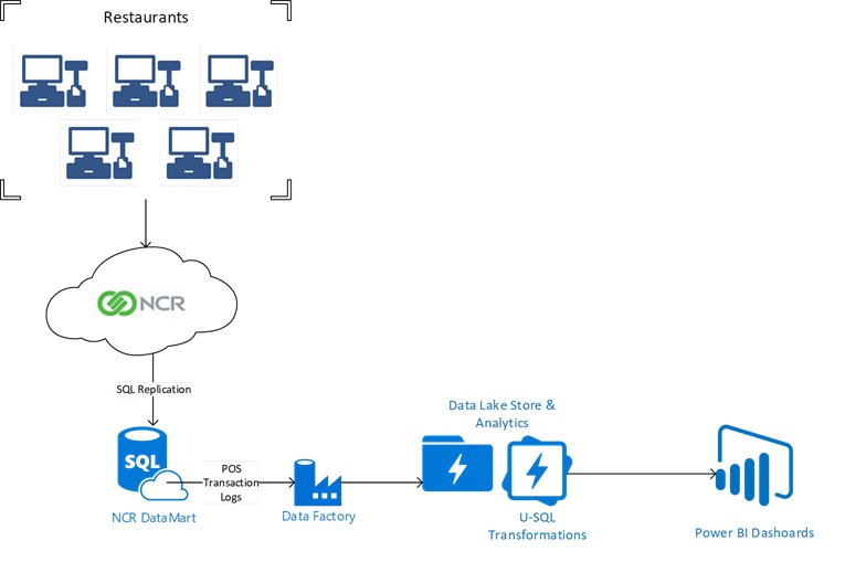 This solution has the restaurant data that is in on-prem SQL Server replicated to Azure SQL Database using transactional replication. Azure Data Factory is then used to copy the point-of-sale transactions logs in Azure SQL Database into Azure Data Lake Store. Then Azure Data Lake Analytics with U-SQL is used to transform/clean the data and store it back into Azure Data Lake Store. That data is then used in Power BI to create the reports and dashboards (business users can build the models in Power BI and the data can be refreshed multiple times during the day via the new incremental refresh). This is all done with Platform-as-a-Service products so there is nothing to setup and install and no VMs – just quickly and easily doing all the work via the Azure portal.