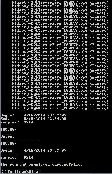 C:\PerfLogs\Blog>relog Ntirety-SQLServerPerf_000095.blg Ntirety-SQLServerPerf_000096.blg Ntirety-SQLServerPerf_000097.blg Ntirety-SQLServerPerf_000098.blg Ntirety-SQLServerPerf_000099.blg Ntirety-SQLServerPerf_000100.blg Ntirety-SQLServerPerf_000101.blg Ntirety-SQLServerPerf_000102.blg Ntirety-SQLServerPerf_000103.blg Ntirety-SQLServerPerf_000104.blg Ntirety-SQLServerPerf_000105.blg Ntirety-SQLServerPerf_000106.blg Ntirety-SQLServerPerf_000107.blg Ntirety-SQLServerPerf_000108.blg -f BIN -o Combined2.blg