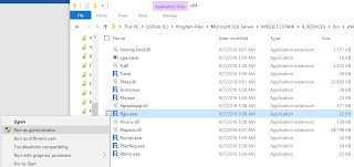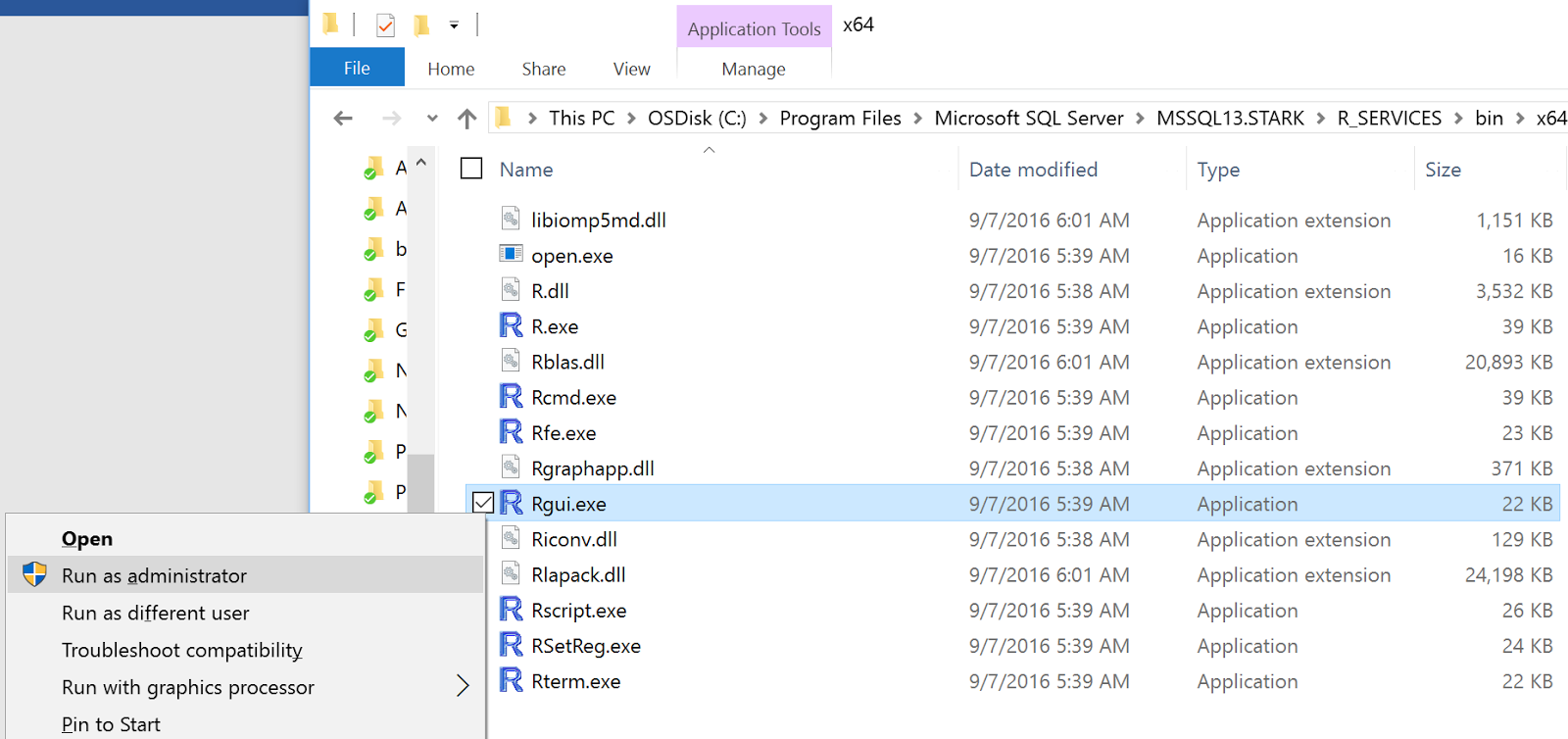 In this case my path is C:Program FilesMicrosoft SQL ServerMSSQL13.STARKR_SERVICESbinx64 , then I want to hold down SHIFT and right click on the Rgui.exe, then select Run as administrator.