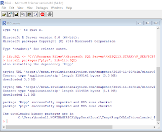 I needed to add a couple packages to my R engine so I could use them and call them from an R script. I realized I had not added any external packages to my R instance so this was a perfect opportunity to write a blog! So here is a quick blog on how you add an R Package to SQL Server. This entire tutorial is if you have internet. If you need to do this for a server, which probably doesn't have access to internet look at this MSDN article, Install Additional R Packages on SQL Server.
