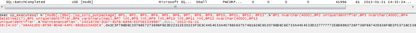 sp_helptext 'sp_ssis_putpackage' The output showed me that @P6 was part of @packagedata and it was saved as column packagedata, an image data type, in table msdb.dbo.