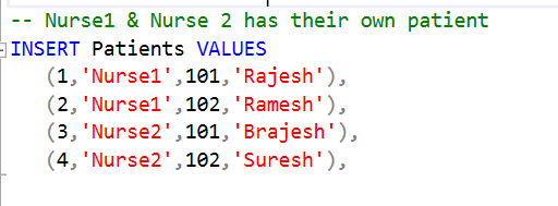 The objective is to show only those rows to Nurse1, Nurse2 in which they are the in charge and a doctor user can see entire table’s data.