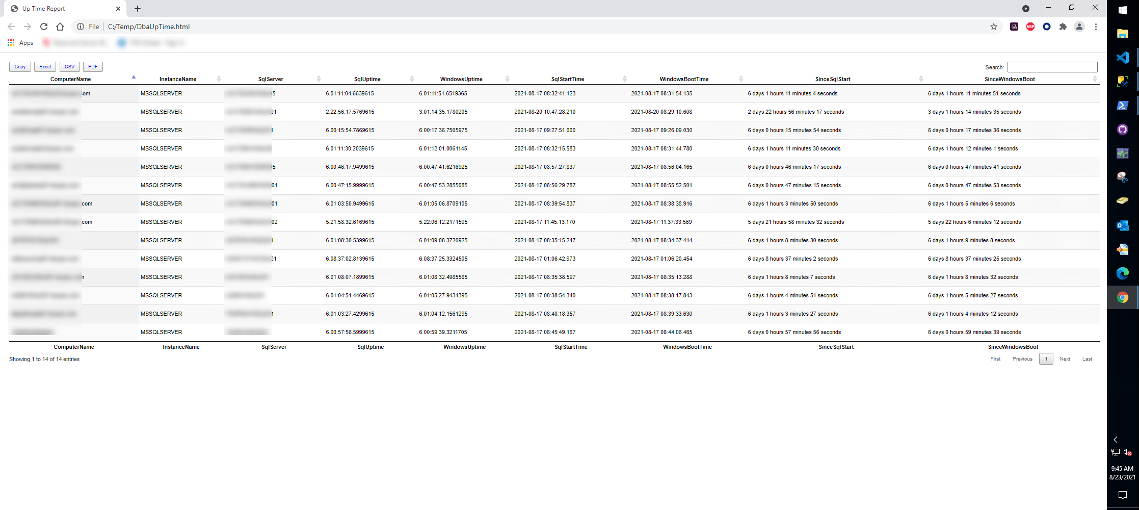 Look at that beautiful HTML output. Not only do you get a clean HTML report, but it is also sortable, searchable, and exportable. Attach this to an e-mail or a service ticket, and you have your validation of SQL Server uptime.