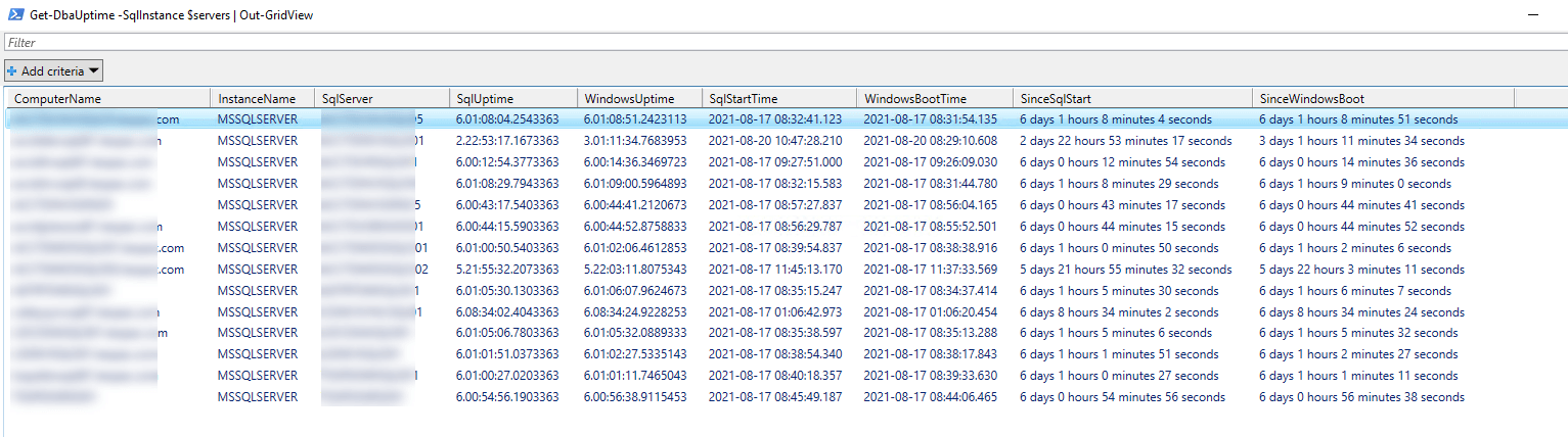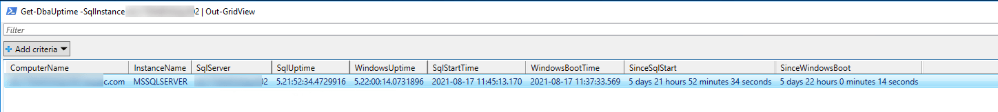 Get-DbaUptime -SqlInstance DemoServer | Out-GridView