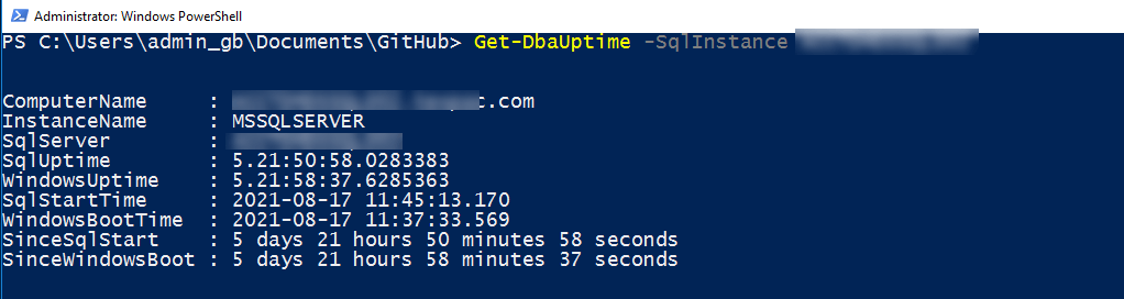 For this example, I will introduce you to the Get-DbaUpTime function in the dbatools PowerShell module. This function has all the information we are attempting to gather.