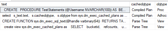 select s_text.text, s.cacheobjtype, s.objtype from sys.dm_exec_cached_plans as s CROSS APPLY sys.dm_exec_sql_text(s.plan_handle) as s_text