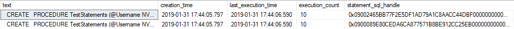 SELECT s_text.text, s.creation_time, s.last_execution_time, s.execution_count, s.statement_sql_handle FROM sys.dm_exec_query_stats as s CROSS APPLY sys.dm_exec_sql_text(s.sql_handle) as s_text