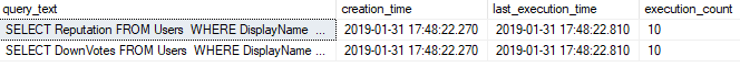SELECT SUBSTRING(text, (statement_start_offset/2) + 1, ((CASE statement_end_offset WHEN -1 THEN DATALENGTH(text) ELSE statement_end_offset END - statement_start_offset)/2) + 1) AS query_text, s.creation_time, s.last_execution_time, s.execution_count FROM sys.dm_exec_query_stats as s CROSS APPLY sys.dm_exec_sql_text(s.sql_handle) as s_text