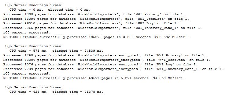 As with the backup operation, the restore took less time for the encrypted database, but you can see that is because of the number of pages processed, because if you check the average restore speed, for the encrypted database is slower (167% slower), so also check this one for your own databases: