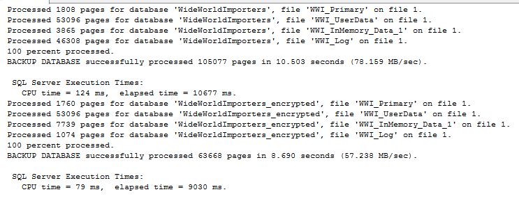 Surprisingly, this one took less time with encryption enabled, around 15% less time... but wait! this is because of the number of pages processed by each backup operation, because if you check the average speed, you can see the encrypted backup operation is in fact, slower (around 33%), so in the case of this operation, it can vary for your environment: