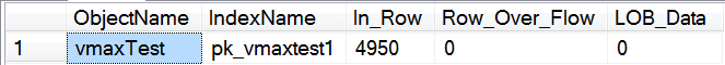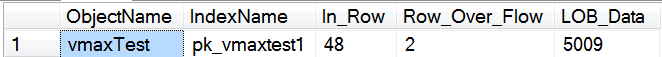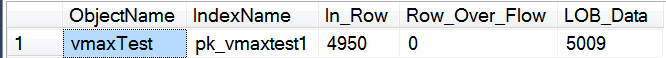 if exists(select name from sys.databases where name='demoInternals') alter database demoInternals set single_user with rollback immediate drop database demoInternals Create Database demoInternals IF EXISTS(SELECT name FROM sys.tables WHERE name='vmaxTest') CREATE TABLE vmaxTest(myid int identity(1,1) , mydata varchar(max) default 'a' ,mydata2 varchar(max) default 'b' ,CONSTRAINT pk_vmaxtest1 PRIMARY KEY CLUSTERED (myid)) INSERT INTO vmaxTest(mydata, mydata2) VALUES(replicate('a',2012)+cast(@i AS VARCHAR(5)), replicate('b', 2012)+cast(@i AS VARCHAR(5))) If you use our script from earlier then you can see we have 4950 IN_ROW_DATA Pages.