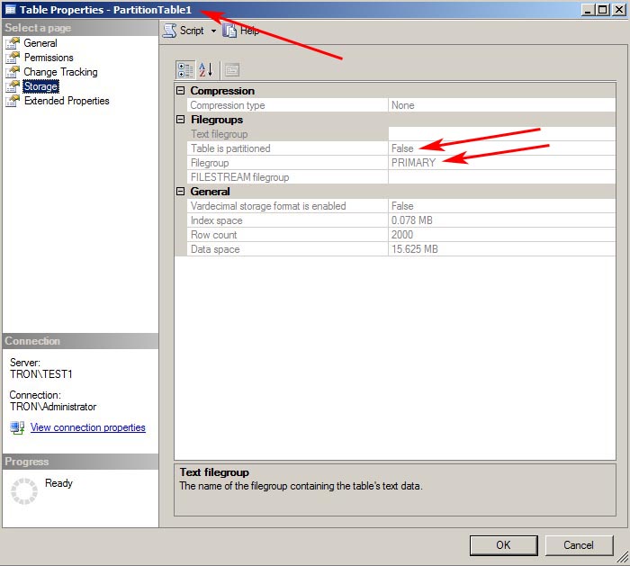 Once again in SSMS, you can will see PartitionTable1 now resides on the PRIMARY filegroup and its data still remains intact.