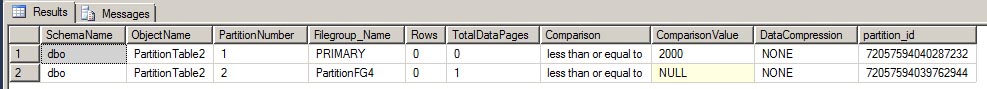 -- Get partition information. SCHEMA_NAME(t.schema_id) AS SchemaName ,OBJECT_NAME(i.object_id) AS ObjectName ,p.partition_number AS PartitionNumber ,fg.name AS Filegroup_Name ,au.total_pages AS 'TotalDataPages' ,CASE boundary_value_on_right ELSE 'less than or equal to' ,value AS 'ComparisonValue' ,p.data_compression_descAS 'DataCompression' JOIN sys.indexes i ON p.object_id = i.object_id AND p.index_id = i.index_id JOIN sys.partition_schemes ps ON ps.data_space_id = i.data_space_id JOIN sys.partition_functionsf ON f.function_id = ps.function_id LEFT JOIN sys.partition_range_values rvON f.function_id = rv.function_id AND p.partition_number = rv.boundary_id JOIN sys.destination_data_spacesdds ON dds.partition_scheme_id =ps.data_space_id AND dds.destination_id = p.partition_number JOIN sys.filegroups fg ON dds.data_space_id = fg.data_space_id JOIN (SELECT container_id, sum(total_pages) as total_pages FROM sys.allocation_units GROUP BY container_id) AS au ON au.container_id = p.partition_id JOIN sys.tables t ON p.object_id = t.object_id ORDER BY ObjectName,p.partition_number; Here we can see both PartitionTable1 and PartitionTable2 are evenly split with 500 rows in each of the four partitions and each in a separate filegroup.
