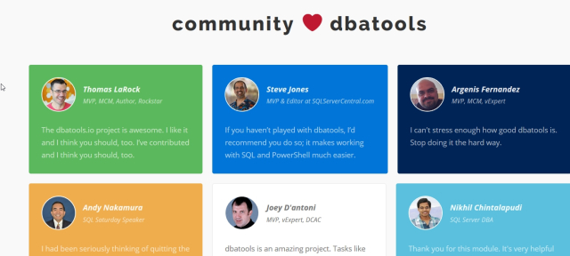 I made the front page of dbatools, as a part of the community that is supporting this project. Along with quite a few others, I’m happy to be there and doing my part to make SQL Server administration and scripting easier.