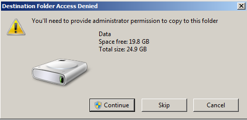 I was stumped, so I turned to the Intrawebs. Google/Binging the error message got me some results. The first couple links didn’t help. Then I came across a message board from the Windows Server forums, Destination Folder Access Denied – Copying file to root of C:\.
