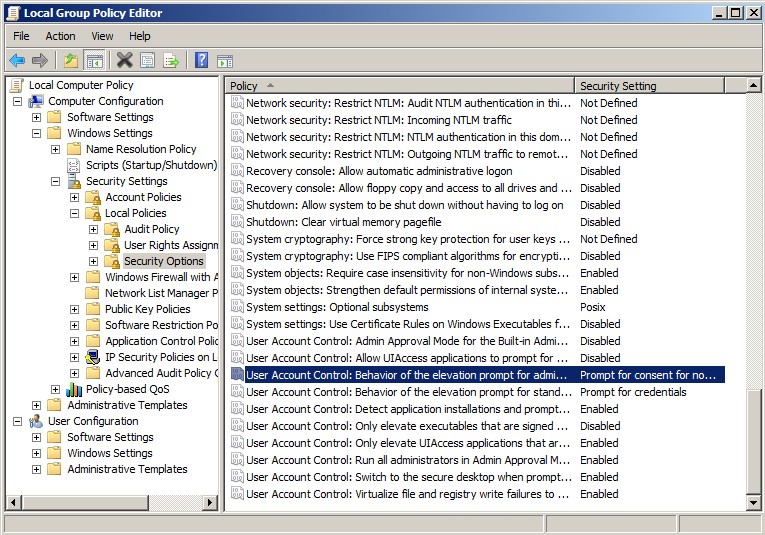 Next expand the tree by Windows Settings | Security Settings | Local Policies | Security Options. Scroll to the bottom we are looking for Policies that begin with User Account Control. First up User Account Control: Behavior of the elevation prompt for administrators.