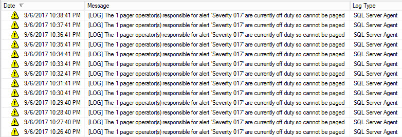 So, what’s the big deal? This server experienced an insufficient resources (space) alert that fired every minute and by having PAGER notifications enabled it caused the error log to bloat, consumed unnecessary space, and created noise in the logs.