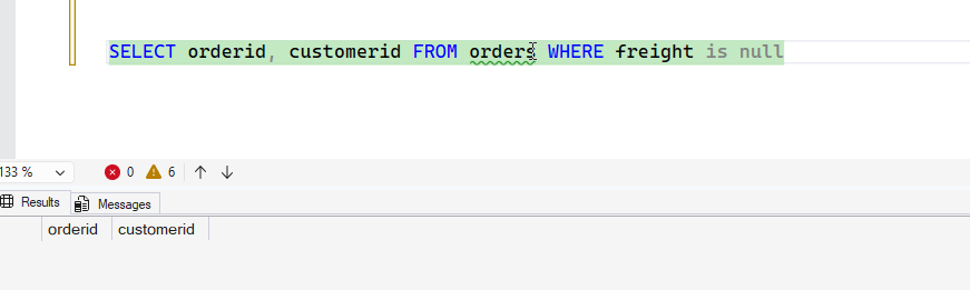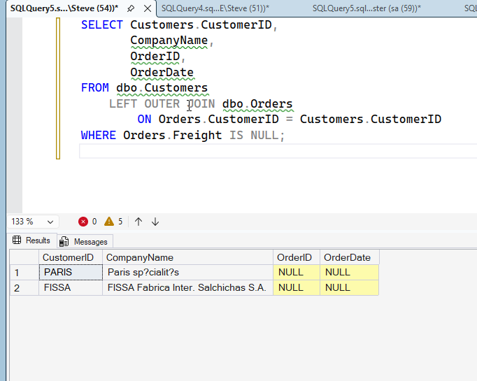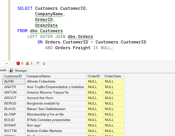 What’s the problem here? Well, the main issue is one I keep doing, fortunately, I catch this. If I move the Freight IS NULL to WHERE instead of the ON, it works. You can see this below.