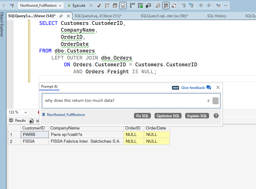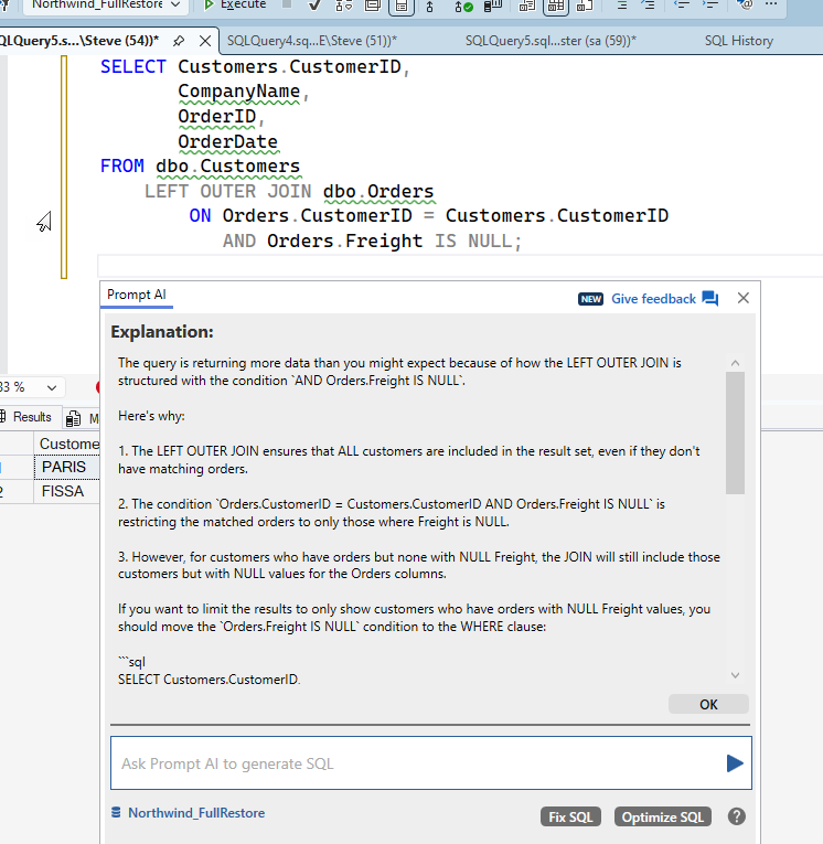 One of the places I’ve struggled with is with outer joins. Usually left/right outer joins where I am trying to get a list of things from a join, but filter out some of the missing items. Here’s an example from Northwind. I want a list of customers joined to orders, but I might have a way where customers filter out those who haven’t been charged freight. There’s likely some business reason, but it escapes me now.
