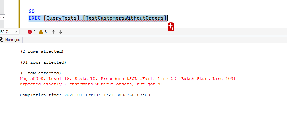 EXEC tSQLt.Fail ‘Expected exactly 2 customers without orders, but got ‘,