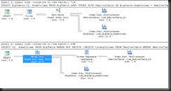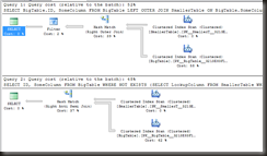 With indexes added, the execution plans are even more different. The LEFT OUTER JOIN is still doing the complete outer join with a filter afterwards. It’s interesting to note that it’s still a hash join, even though both inputs are sorted in the order of the join keys.