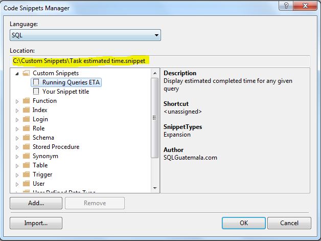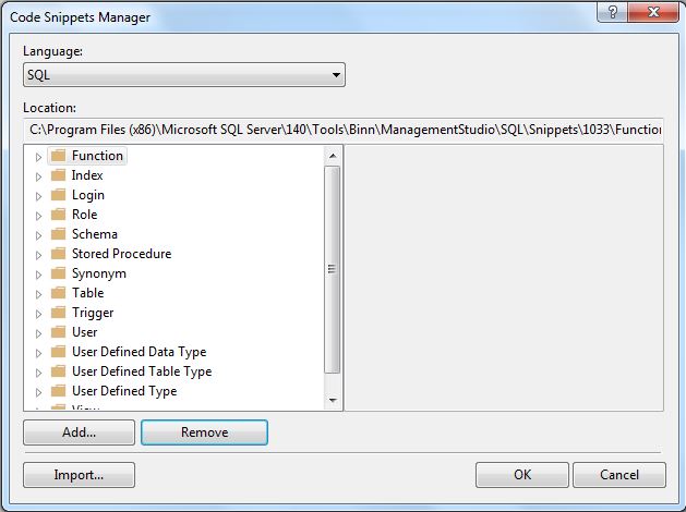 We save it with the .snippet extension to a folder in our computer, the next step is to load it to SSMS.