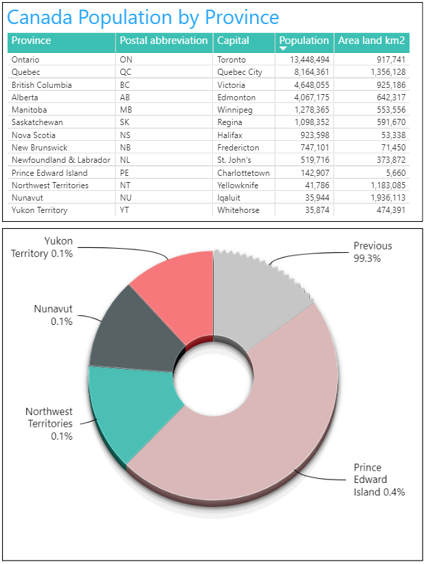 If my dataset contains a customer location info or list of countries where all the tweet messages came from based on a recent marketing campaign then I'm tempted to visualize them. Let's take an example of the following report with the Canadian population by Province. What would be the best way to analyze the population itself, a table, a map, a bar or a pie chart or combination of all of them?