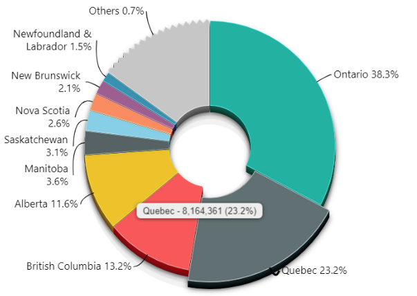 I could easily sort the table by the Population column or look at another non-map visualization (Donut chart, for example, developed by ZoomCharts company) to realize that Quebec is the second largest province by its population.