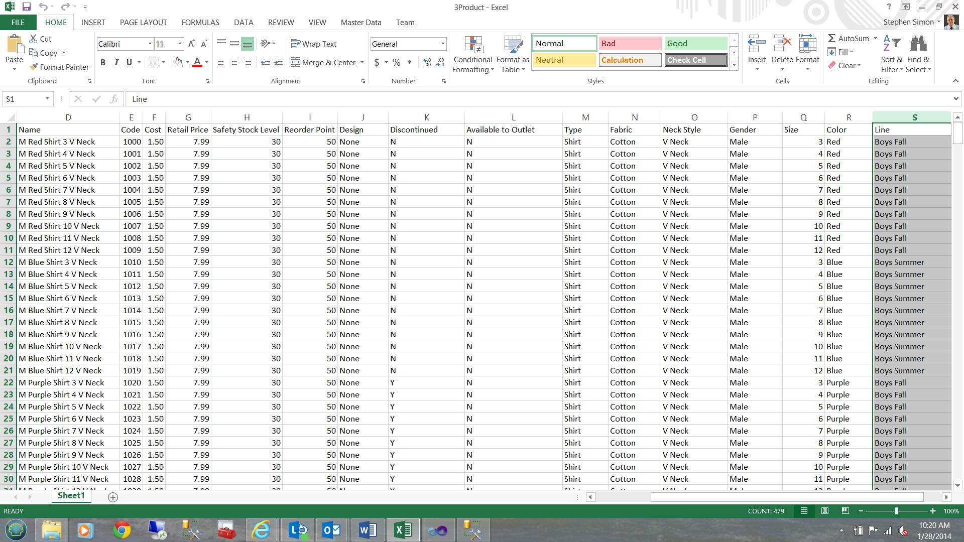 Note that the product table has the color already shown. Let us take a look at how this is obtained from the spreadsheet shown in the NEXT screen dump.