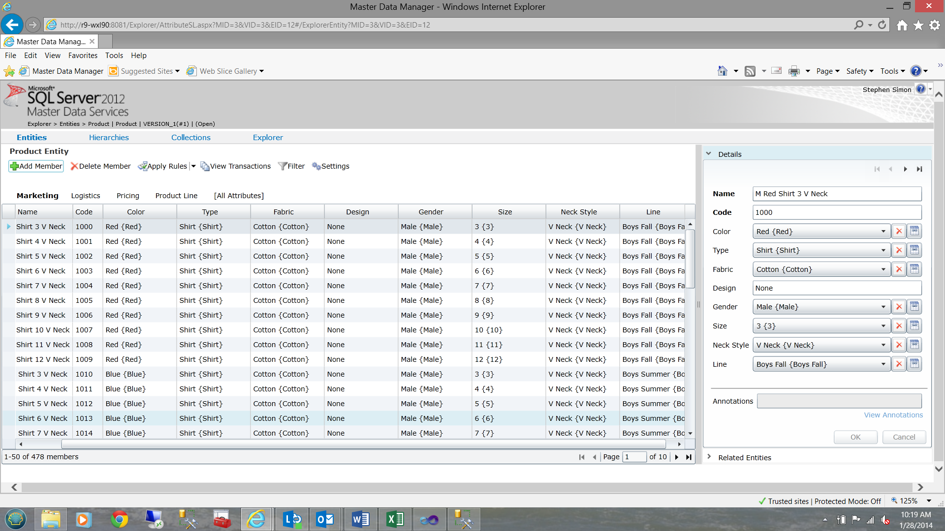 Note that column “R” contains the color. Whilst the ‘code’ and the ‘name’ within the ‘color’ load that we just ran, are the same, what in essence is stored within column “R” is the code (the KEY). It is almost as if Master Data Services will do a “Look Up” once loaded. This will become more evident when we discuss our daily load processing (in an upcoming ‘episode’).