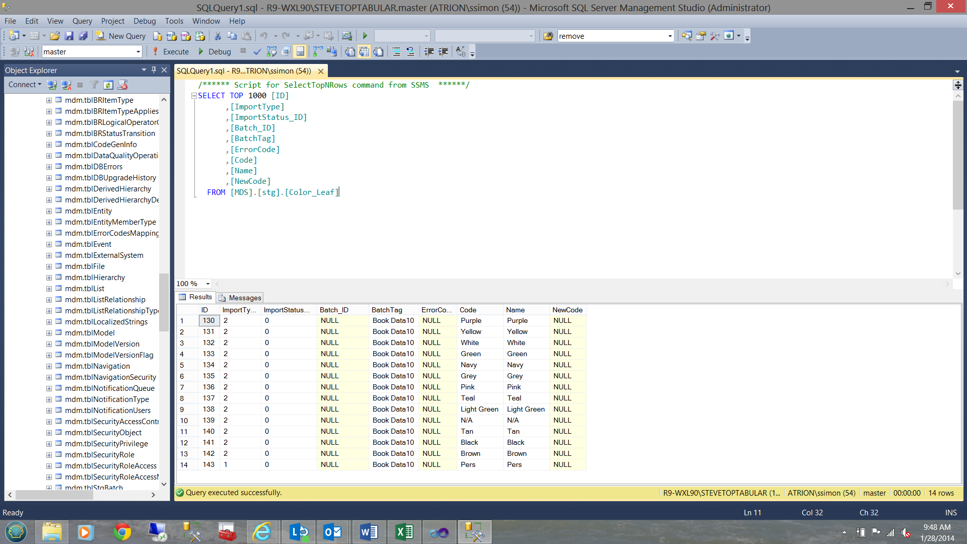 The astute reader will note that in the screen dump above, the ImportType is set to 2 EXCEPT for the last record(to be discussed further down). I changed the ImportType to 2 for preparation of the paper so that I am able to show the batch waiting to be processed FROM this staging table to its FINAL destination in the MDS database. One important point to state at this point in time is, do not look for a ‘color’ table per se. Data storage within MDS is not handled in a similar fashion as it is with a standard SQL Server database.