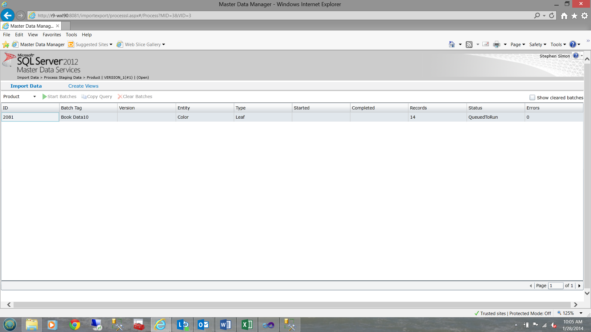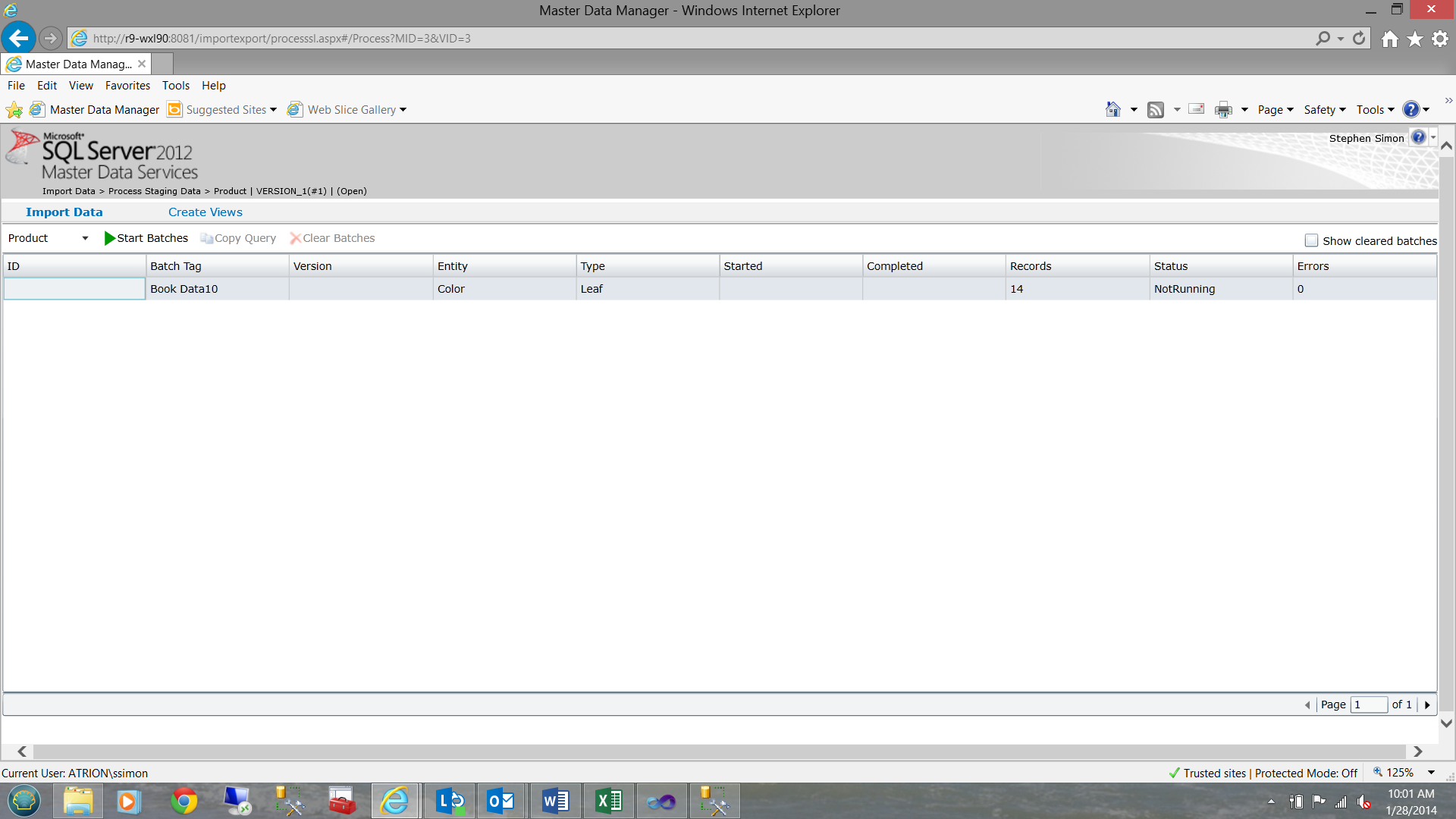 Having run our package and thus having loaded our staging table, did something ‘strange’ under the covers. Master Data Services woke itself you and if you look within the Integration Management tab of Master Data Manager, you will note that there is a batch there that requires processing (See the screen dump below).