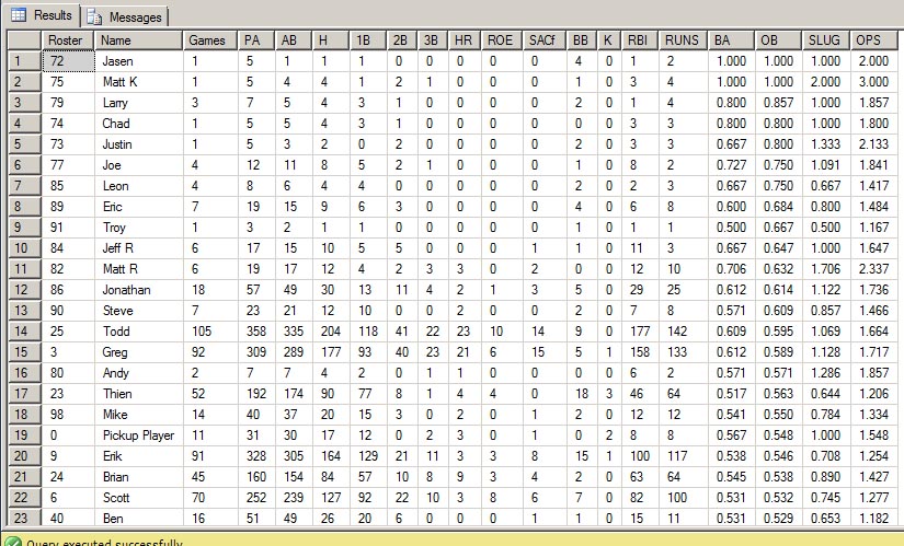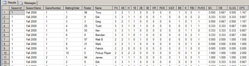 SELECT * FROM IndividualStatsTeam WHERE SeasonName = 'Spring 2012' As you can see, two of the things I'm passionate about, SQL Server and softball, work very well together. Although this was done as a hobby, I use it every single week. What kind of hobbies can you use SQL Server for?