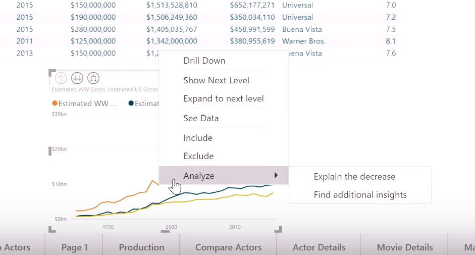 Kim provided more details on how quick insights bring the power of machine learning to Power BI Desktop. Kim right-clicked a point on the line chart which exposed the Analyze option and then the options to Explain the decrease and Find additional insights. Notice that the point Kim right-clicked on is a low point in the line chart. Power BI Desktop automatically detected the dip and offered the option to “Explain the decrease”. Very cool.