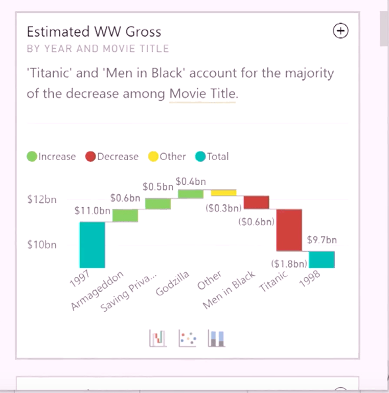 When Kim selected Explain the decrease, the following waterfall chart was displayed. Kim then clicked the + button in the top right to add the chart to the report. I think this is an excellent feature that would allow me to quickly add useful visualizations with useful insights to a report that we might have missed.