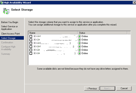 - Select Next,which will open the storage configuration screen.This will list all the disk available under the available storage group. Select the appropriate disk and click Next