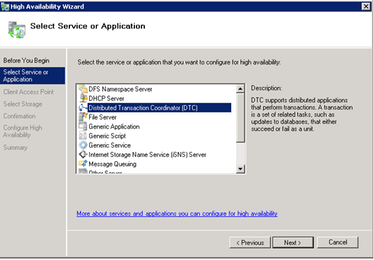 - Select next which will list Services or application that can be configured for the high availability.Select the Distributed Transaction Coordinator(DTC)