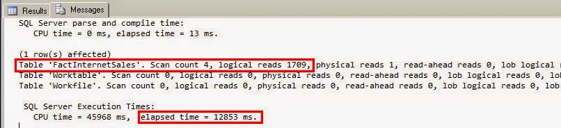 Here we see similar results. This aggregation query took 2.3 seconds and had 4604 logical reads against FactInternetSales.