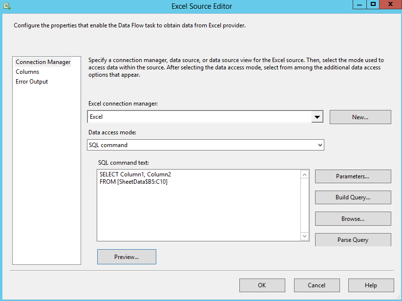 And let's say, initially I needed to load only Column1 and Column2 data. So my data source in the data flow SSIS task with the SQL command