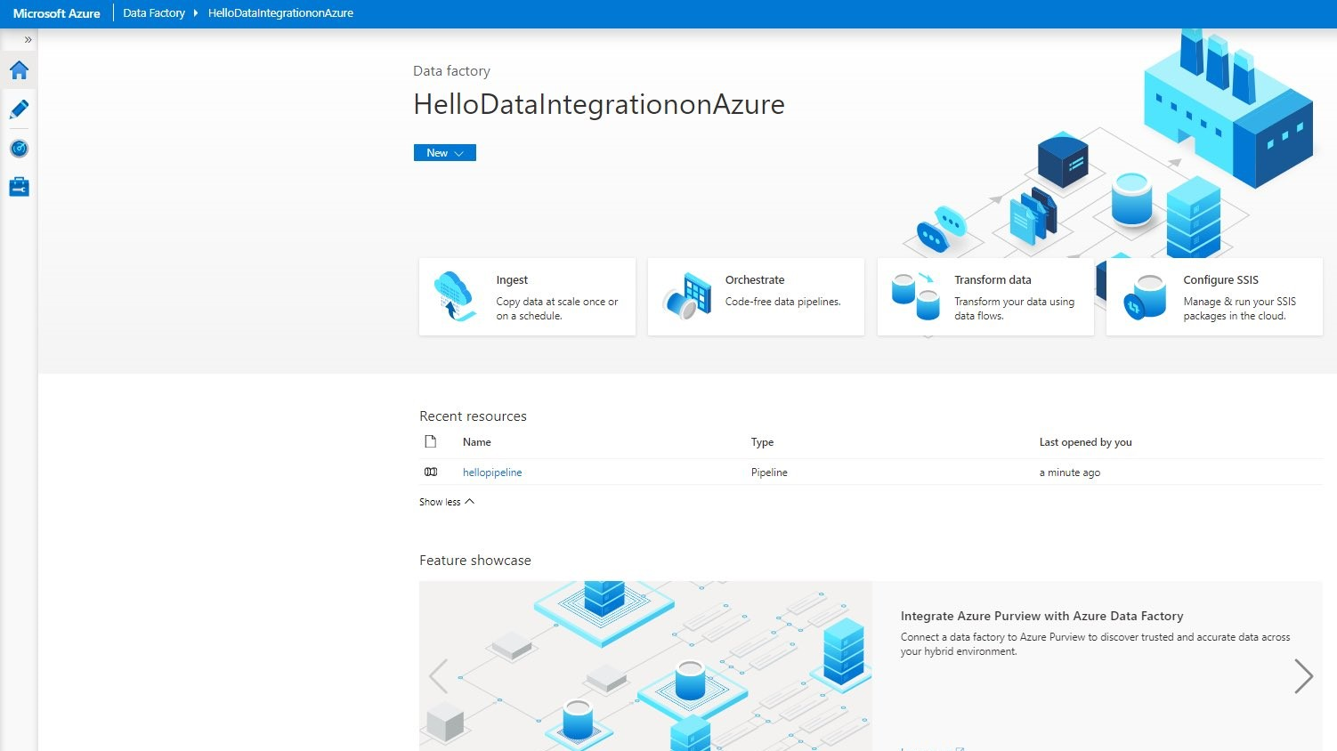The updated home page looks fresh. Rectangular buttons to start “Ingest”, “Orchestrate”, “Transform data”, “Configure SSIS” wizards are very handy for new ADF users to easily create new data transformation components; which is a less preferred way for existing data factories developers.
