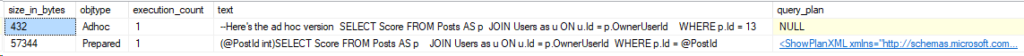 Okay, so this is as expected. The Adhoc query didn’t save the execution plan into cache, and the size is a lot smaller. But what if we didn’t replace 13 with the variable @PostId?
